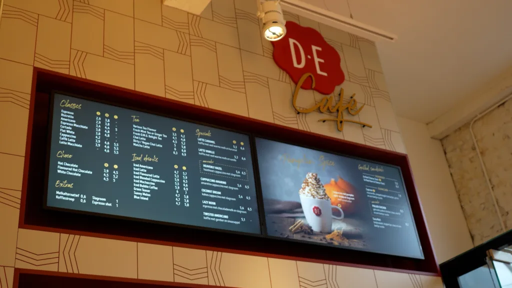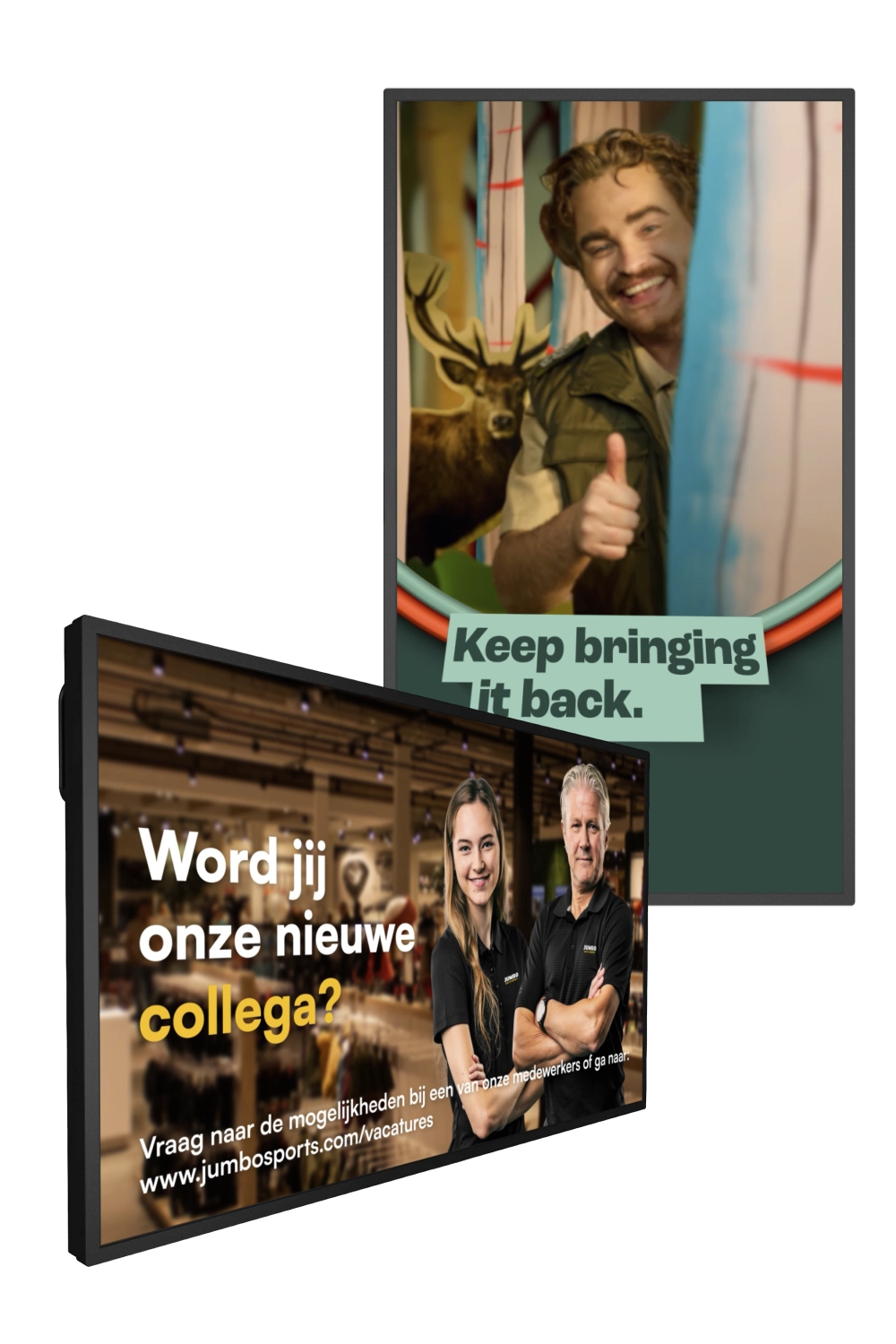 Van etalage tot lobby en kantine. Eén platform voor planning, distributie en monitoring met content die mensen zien en onthouden.