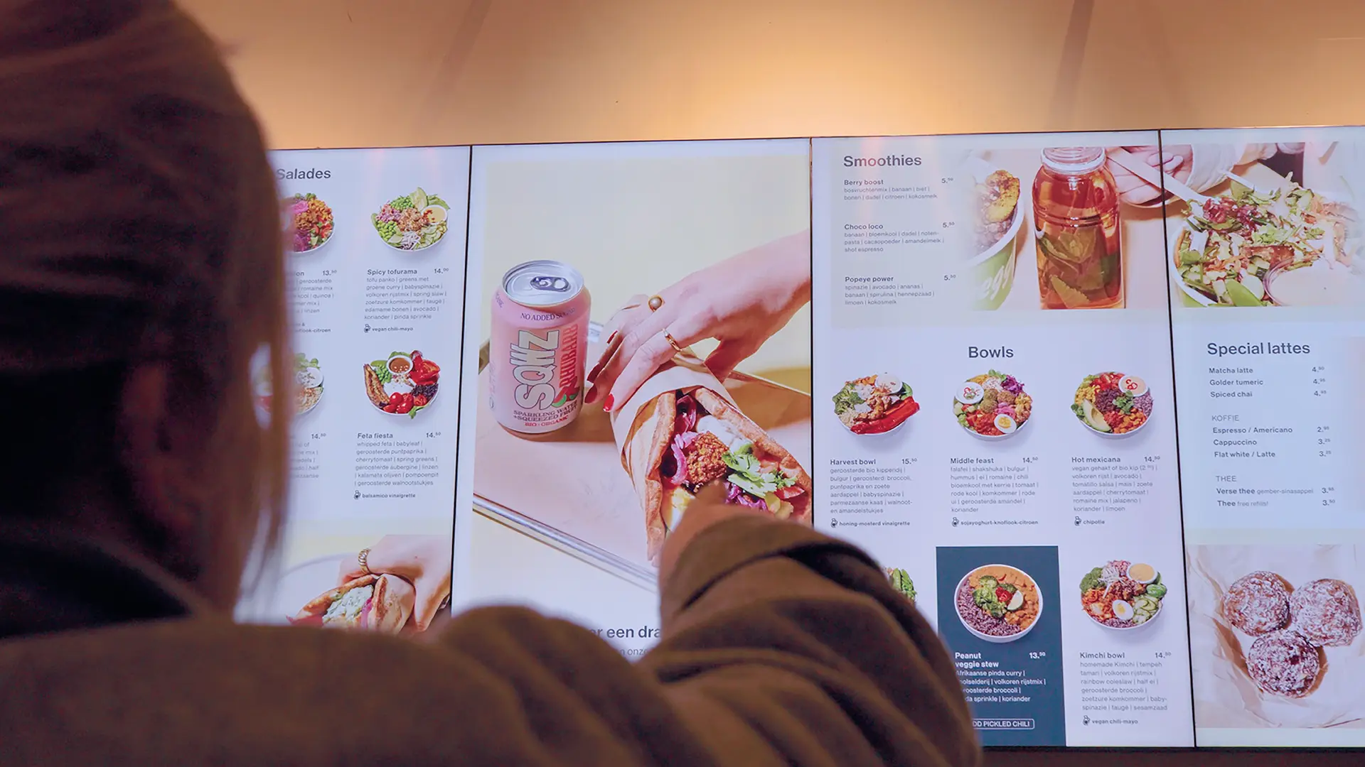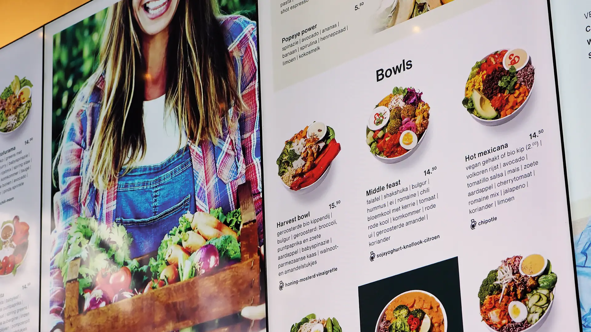 Het menu van SLA is veelzijdig salades, bowls, wraps, seizoenproducten, vegan & vleesopties en wisselt regelmatig. Klanten verwachten snelle keuzes, overzicht en transparantie over ingrediënten. SLA had menuborden nodig die zowel flexibel als consistent merkgericht zijn.
